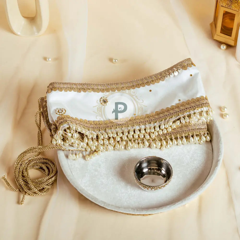 Material: Thaal Base Material steel covered with velvet fabric and embellished with pearls, mirror and beads.