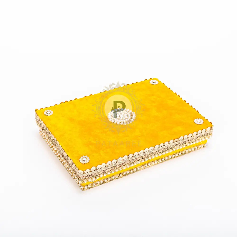 Perfectly paired with the bhaji box, the barfi box leaves behind its plain cardboard past to shine in a yellow Zehra collection look with ivory and champagne gold accents. A wedding essential, it’s ideal for shagun and gifting alongside invites or during the ceremonies.